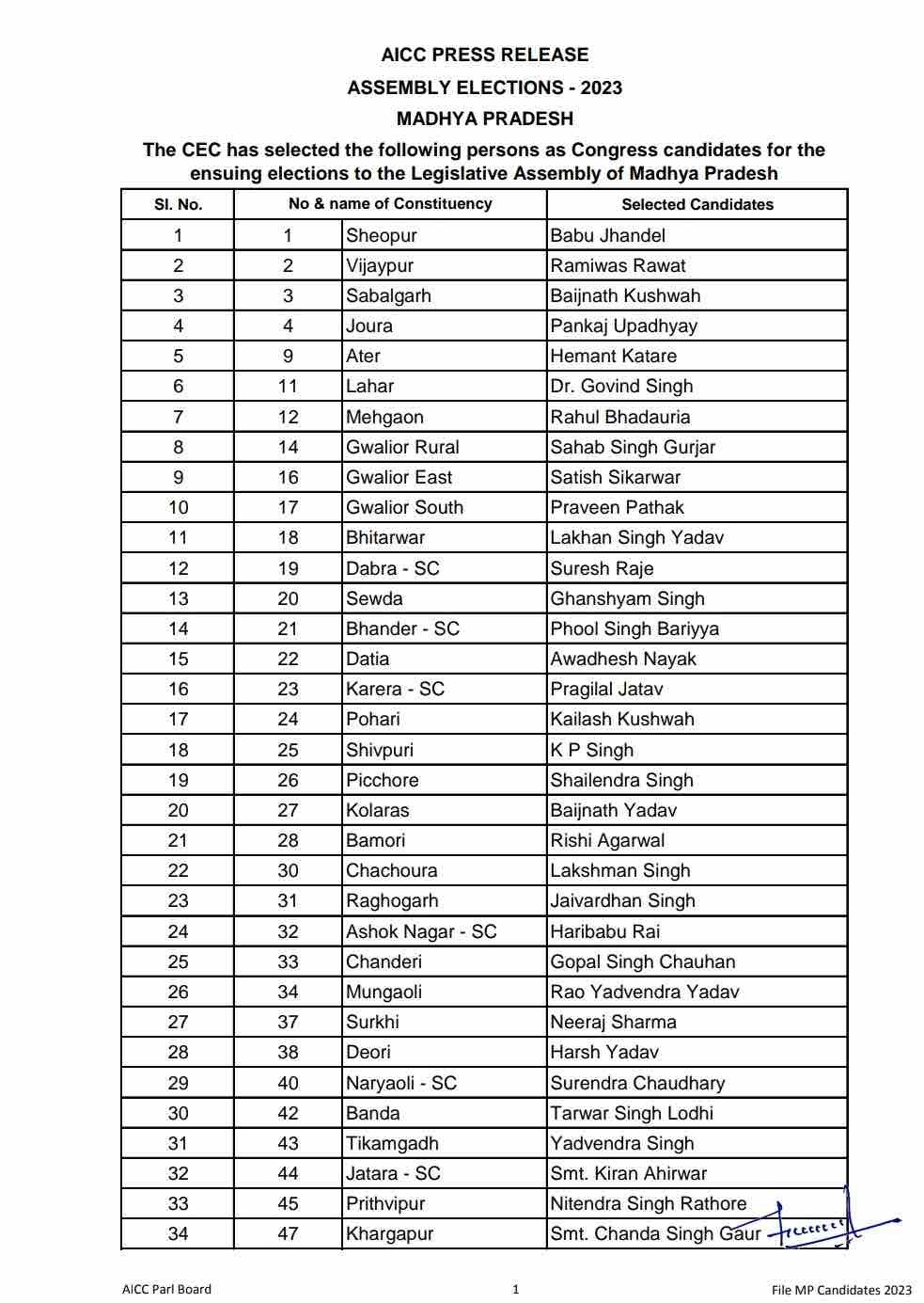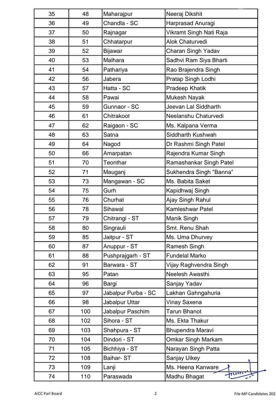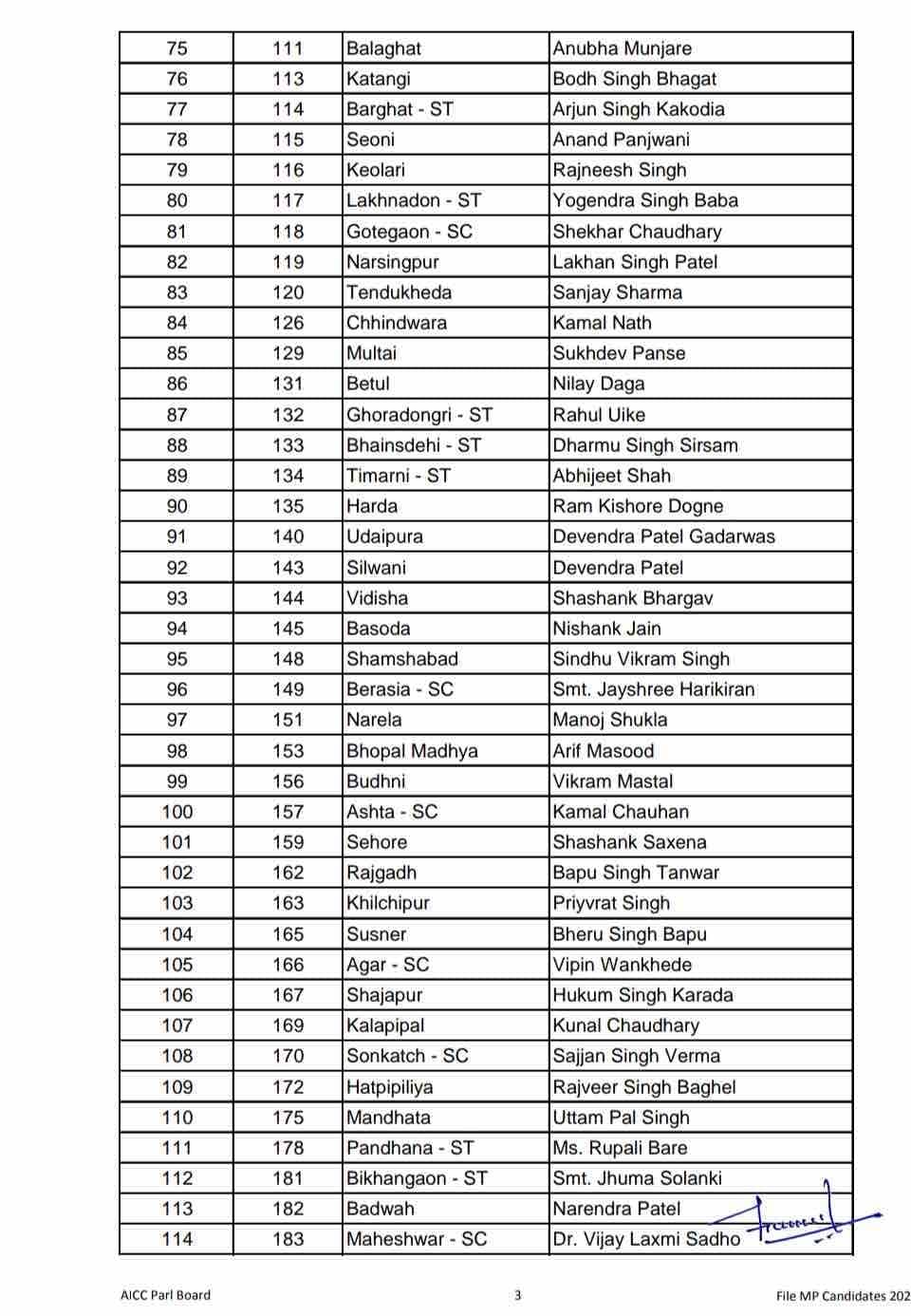 एमपी के पूर्व मंत्री जीतू पटवारी को राउ से टिकट दिया गया है। आगर मालवा से विपन वानखेड़े, सुसनेर से भेरू सिंह परिहार ने शोरूम को बनाया है। यूनेस्को सरकार में विधानसभा अध्यक्ष रह रहे एनपी प्रजापति का टिकट कट गया है। उनके गोगांव सीट से कांग्रेस ने शेखर चौधरी को उम्मीदवार बनाया है। कांग्रेस ने इस विधानसभा चुनाव में युवाओं पर दांव खेला है।