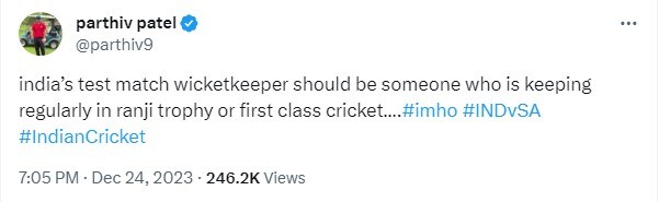 भारतीय क्रिकेट टीम के लिए लंबे समय तक विकेटकीपिंग करने वाले आंशिक पटेल ने सोशल मीडिया के माध्यम से टीम इंडिया को पहले टेस्ट में चयन के लिए सलाह दी है। पूर्व यूजर ने लिखा, ”भारतीय टीम के लिए टेस्ट मैच में उसे देखना चाहिए जो लगातार रणजी ट्रॉफी या फर्स्टक्लास में यह जिम्मेदारी निभा रहा हो।” इस बात से साफ है कि वह केल राहुल की जगह साउथ अफ्रीका के खिलाफ टेस्ट मैच में केएल राहुल की जगह के बारे में बात कर रहे हैं।